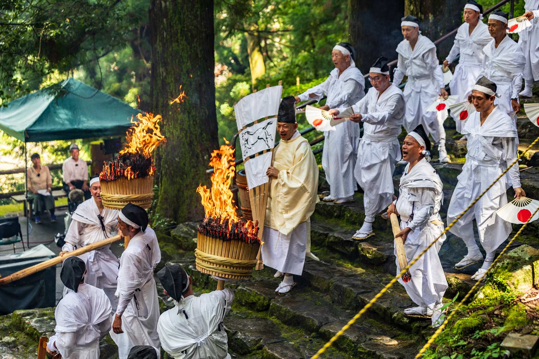 12基の大松明が境内から階段へと繰り出し、円を描くように石段を昇り降り