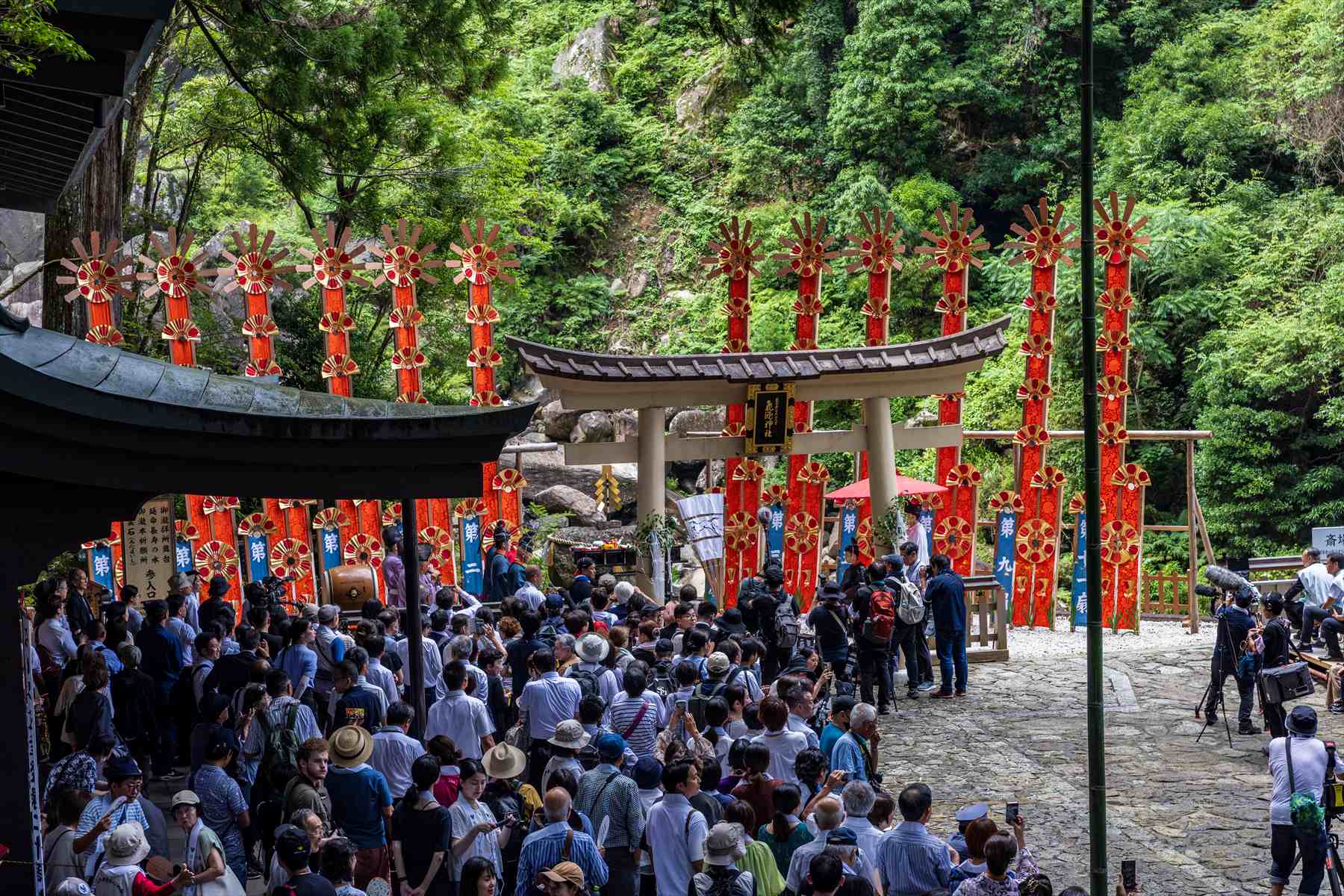 飛瀧神社の鳥居を中心に、12神体の扇神輿が那智の滝前に納められました