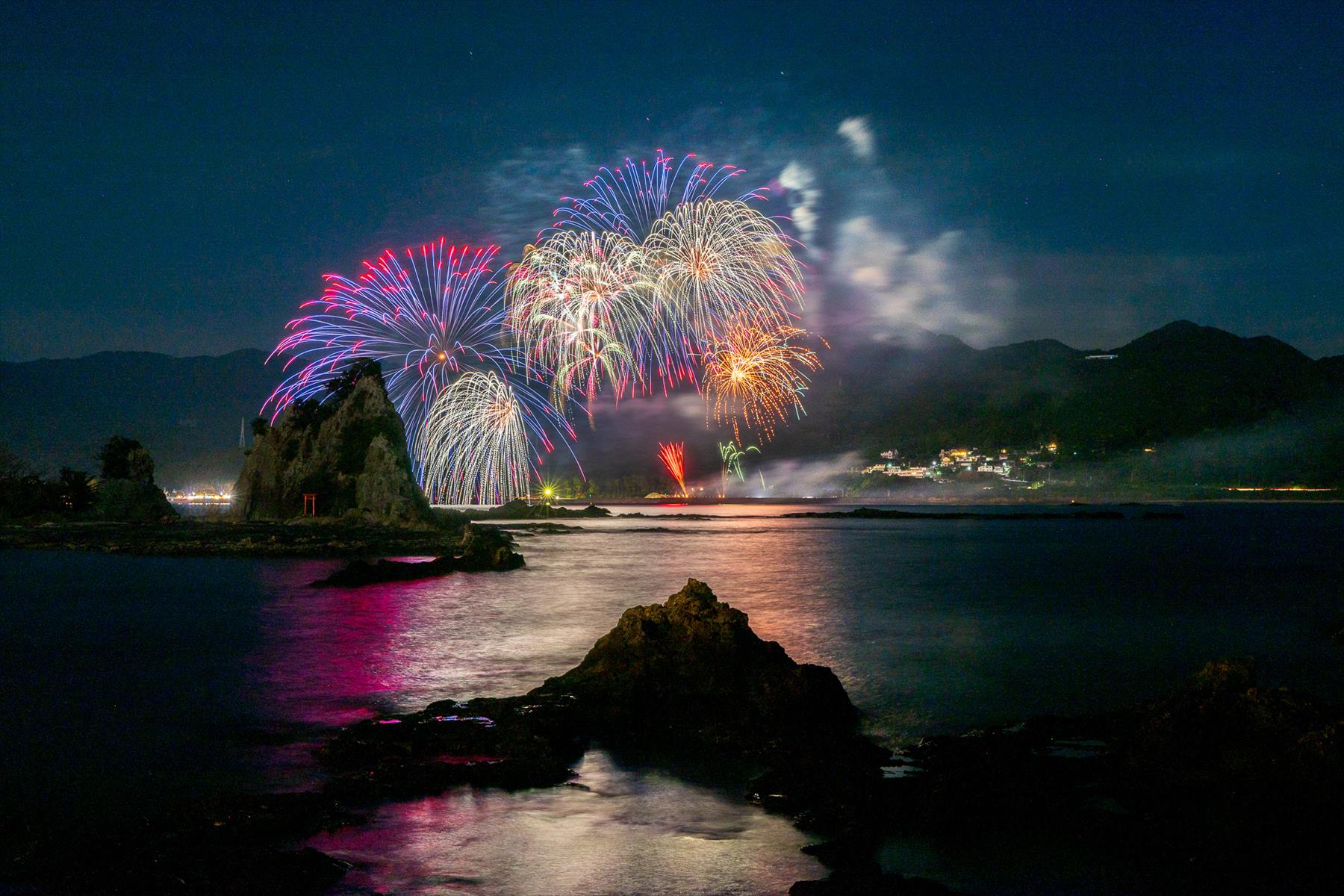 私が位置している場所は弁天島と呼ばれ、勝浦側である。花火は向かいの那智港より打ち上げられます。メインの観覧席となるのは、那智港とこの弁天島の中間あたりの海水浴場です。それでは、那智勝浦花火大会の開演です。