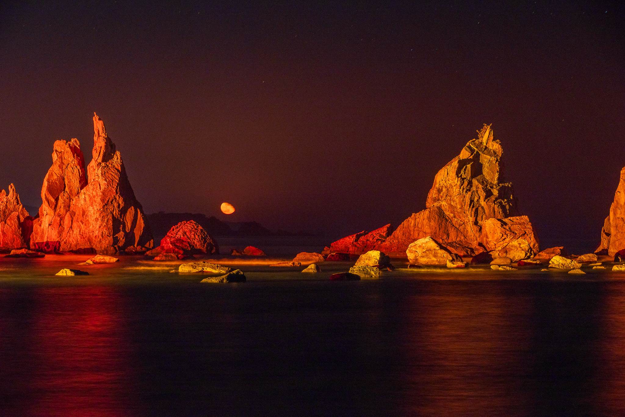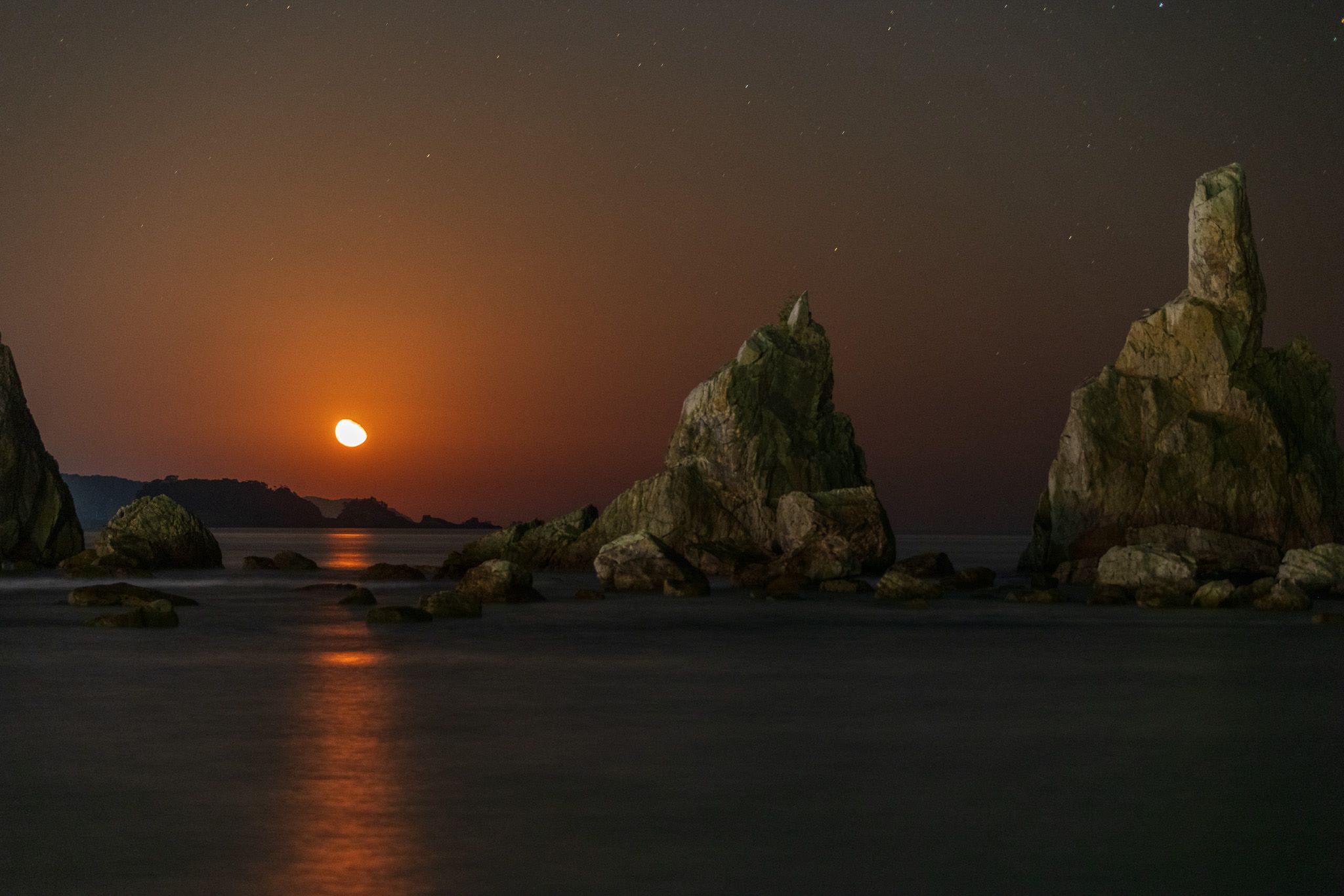 さて、何時ものような真っ暗な橋杭岩に戻って変化した月と海の表情でお別れショットです。