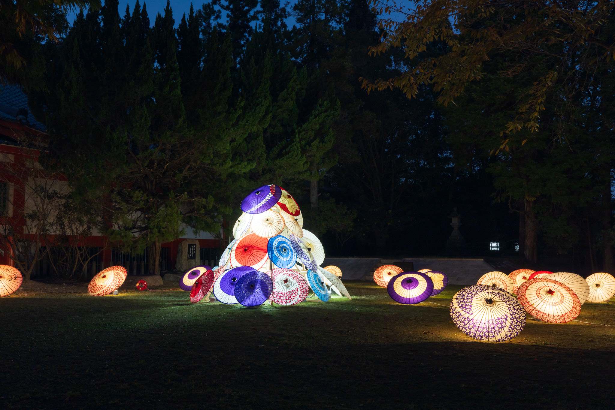 和傘のライトアップも風情があるなあ
