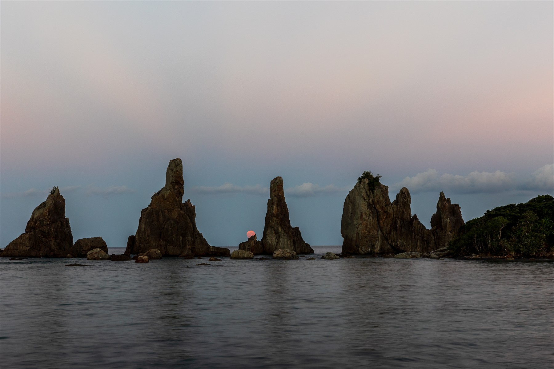下の写真で説明すると、左から小さい拝み岩(弘法大師の弟子)、大きい拝み岩(弘法大師)と呼ばれ、月を弘法大師の合掌している手に乗せるように撮るカメラマンが多いです。敢えて、私は弘法大師岩の右に佇む岩に注目したいのです。静かにやや左方向に頭を向けて合唱する、比丘尼像とかマリア像に似ているように思えるのです。
