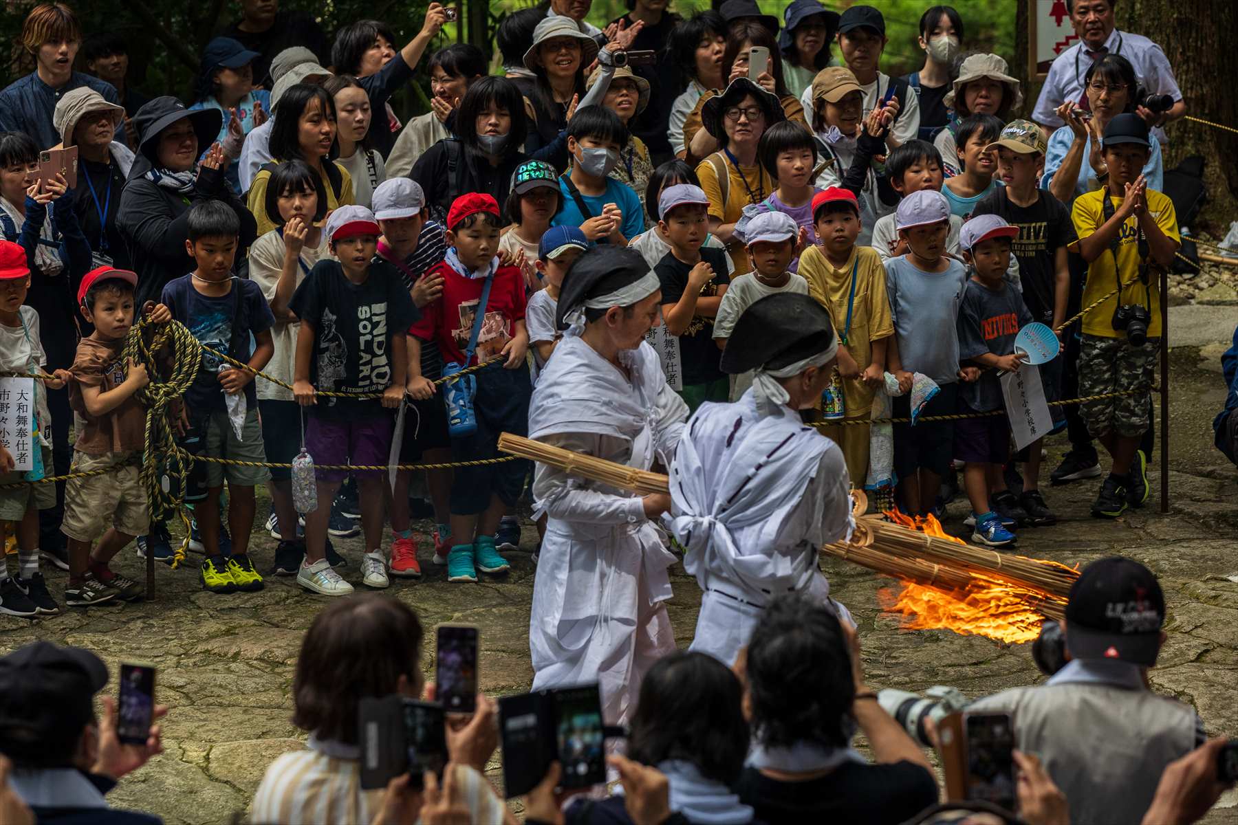 2人1組で夫々が松明を持ち交叉させた状態で飛瀧神社境内から階段を駆け上がります