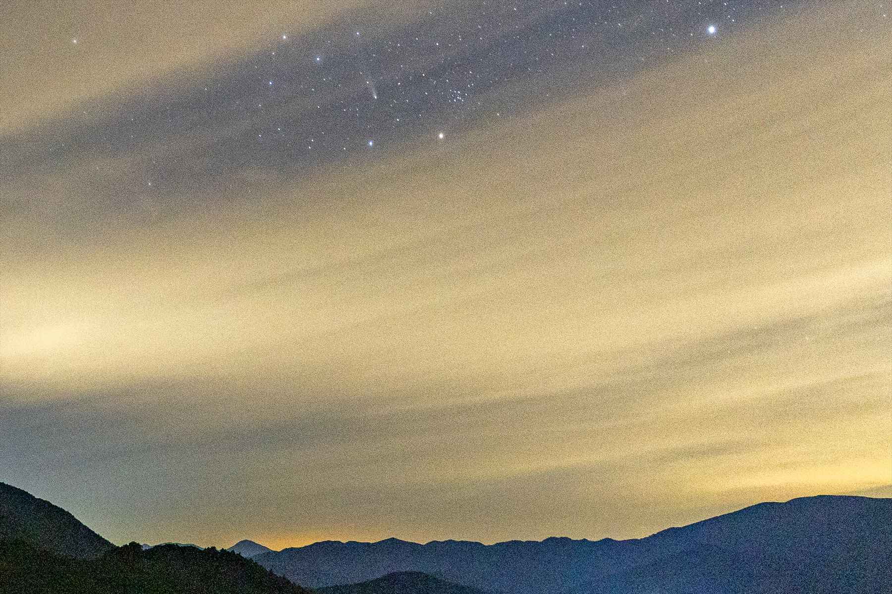 彗星が山裾に隠れるまでとは思ったが、山裾付近は結構光が強いので、見えなくなってしまう可能性が高いだろうし、空腹と寒さで辛抱の限界がきているので