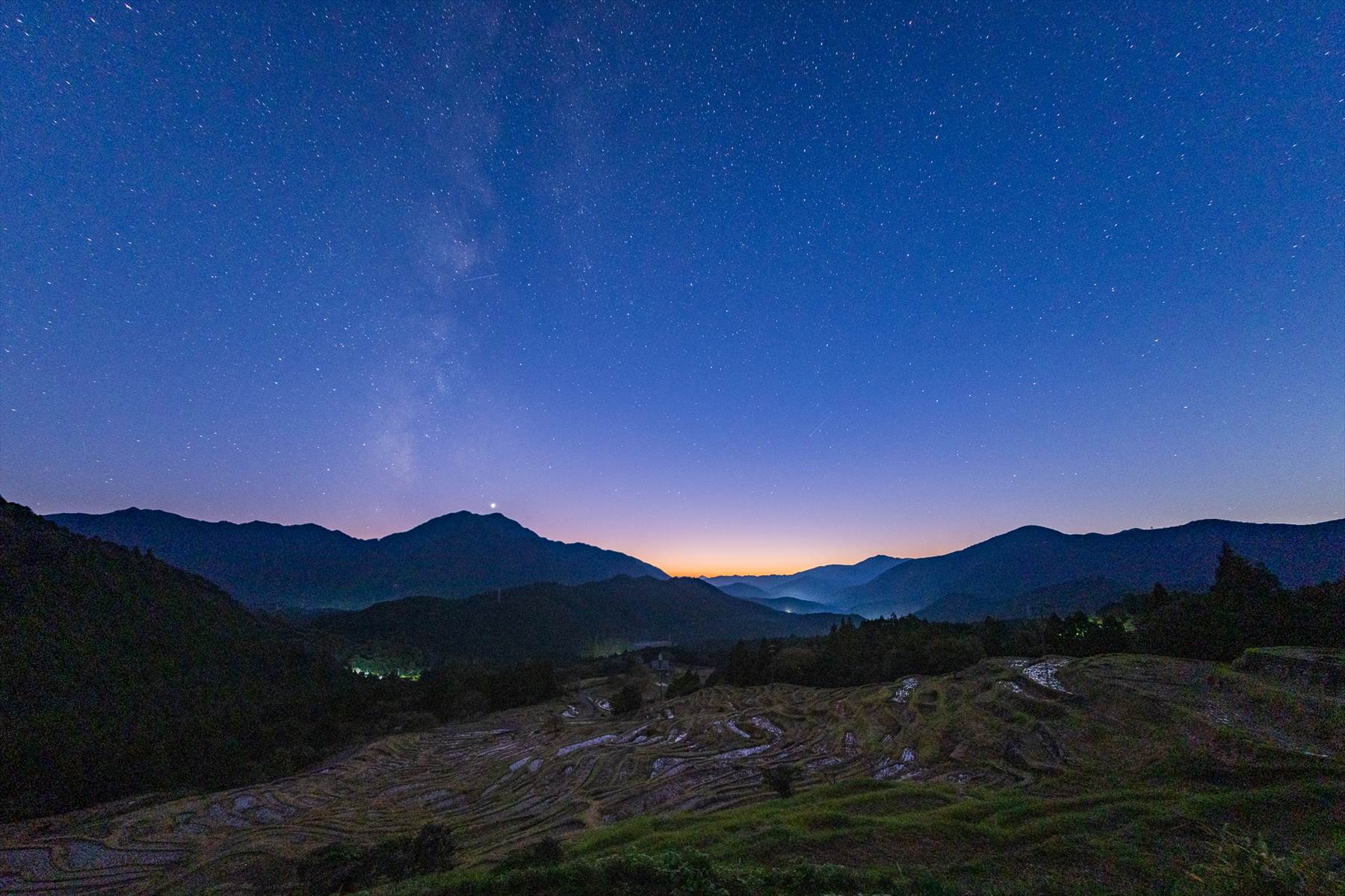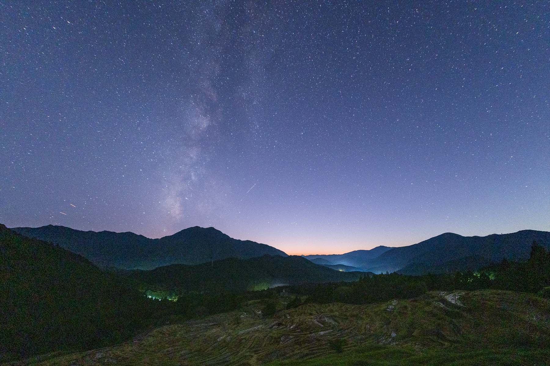 今日は、久し振りの秋晴れの爽やかな天気なので、アサギマダラやコスモス畑を撮影していたが、この空なら念願の千枚田での星空が撮影出来るだろうと、夕刻前に転戦でした。雲の無い絶好の星空の撮影チャンスである。ただ、不安要素が一つ在って、アトラス彗星が未だ撮影可能かどうかである。相当遠くて、輝きの度合いも弱くなっていると思うので、恐らく今日が撮影可能なラストチャンスで間違いないだろう!