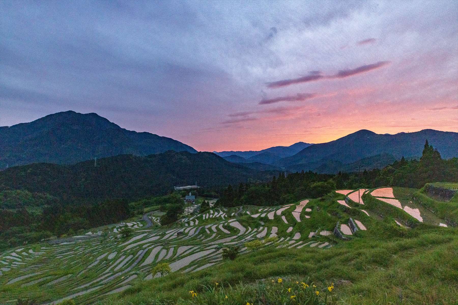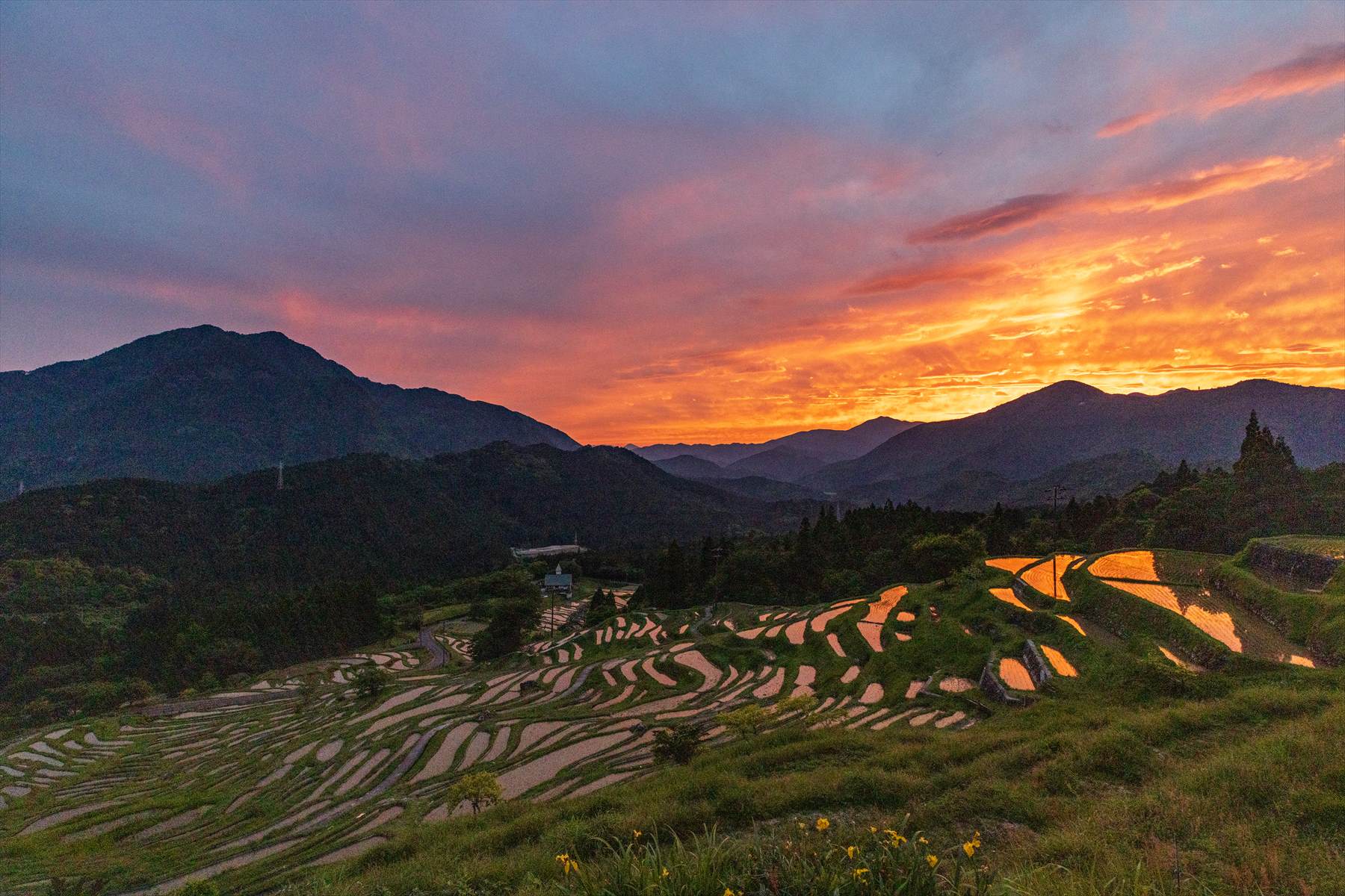 ご覧ください.短い時間の内に、雲が染まり棚田の水面を染める領域を拡大していきます。