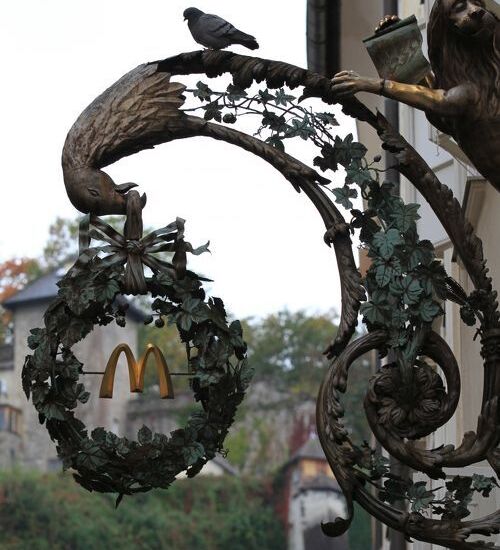 しばらく行くと、マクドナルドがあった。こんなところにまで進出しているのかと感心したが、目についたのはその店構えだった。今まで知っているあの赤や黄色で色どられた派手な装飾は一切ない。ヨーロッパの都市は街並みの景観をとても大事にするが、果たしてマクドナルドも、古い時代に合わせるように茶をベースにした落ち着いた色使いで見事に変身していた。