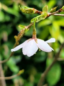 前号で、近くの公園に植えたクマノザクラが初めて開花したことをお知らせしましたが、続いて27日、マンション内に植えた木にもたった一輪ながら小さな花が咲きました。嬉しい限りです。