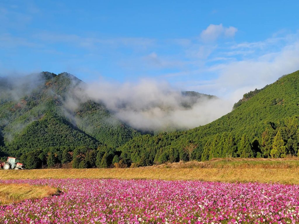 風伝おろしは、山間部の尾呂志(おろし)地区で見ることができます。風伝おろしは10月から3月にかけて、特に日中と夜間の気温の差が大きかった日の翌朝に発生しやすいと言われています。日中に温められた山肌が夜間に冷やされ、風伝おろしの元となる朝霧が発生しやすいのです。この霧が山を越える高さまで発達し、そこに尾呂志側へ風が吹くと、風伝おろしが発生します。