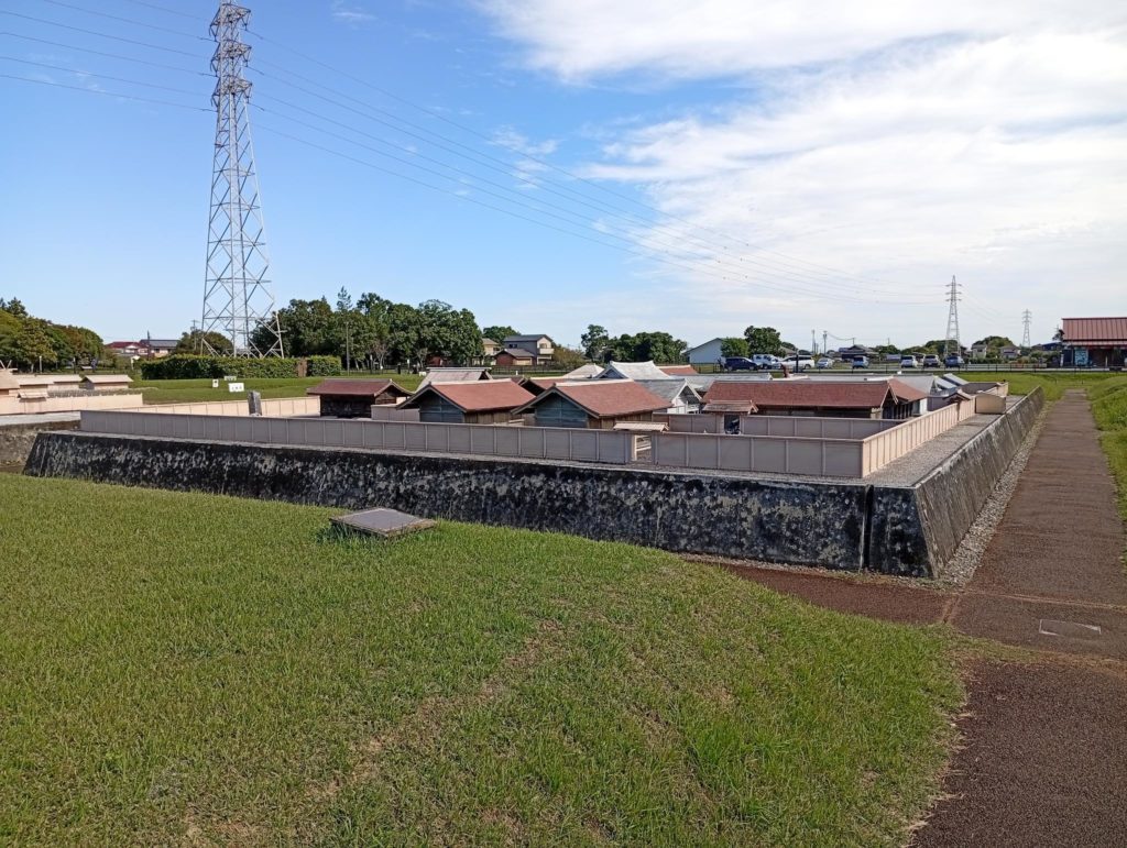 体験館を出ると前方に斎宮跡の広い敷地が広がっており、思わずほうーっとため息がでる。斎宮跡は、東西2㎞、南北0.7㎞の137haを占める全国屈指の規模で昭和54年に国史跡に指定された。広場では史跡地の全体を10分の1に縮小した模型が設置され方格地割を再現している。