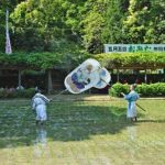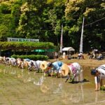 社殿の裏手に回ると御神田がある。ここで毎年5月5日に、豊作豊漁を祈願して行われる神事が御田祭で、桃山時代の風俗衣裳を身につけた男女16名が田楽の囃子にのって苗を植えていく。挿苗後は大団扇を打ち合わせる「団扇角力(うちわずもう)」が行われ、御神田での行事が終ると拝殿前に移り「ハエーヤハエ」の掛声とともに「豊年踊」が、そして「団扇破り」が行われる。
