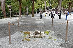 外宮正殿の参拝を終え、別宮に向う道の脇に、小さくしめ縄に囲まれた三つ石がある。かつてここには宮川の支流が流れていたが、昔の大地震で地形が大きく変わり、川がなくなったと言われている。