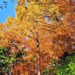 一番上は、伝統工芸館から下に下る途中の展望台から見たメタセコイヤ。2枚目は、岡本太郎美術館の庭から見たもの。3枚目は、メタセコイヤの樹林の下から見上げた景色です。