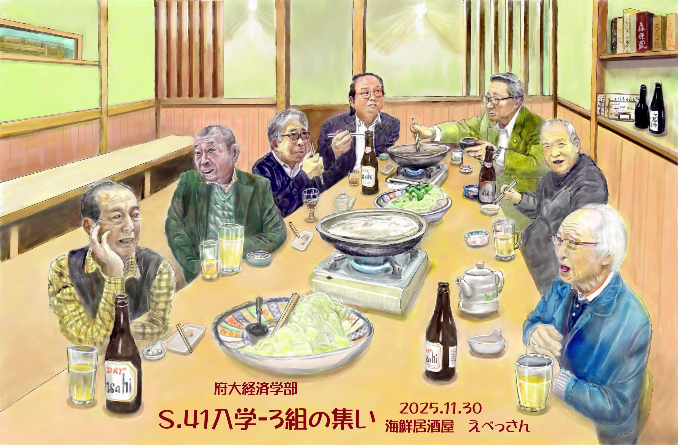 2026-02-01 / 最終更新日時 : 2026-01-29 Tony 土谷重美 似顔絵「府大経済同窓会」〜土谷重美氏 似顔絵作家、土谷重美さんから新作の絵が届きました。 いつもながらの軽妙なタッチで微笑ましさが伝わってきます。 コメントを残す コメントをキャンセルメールアドレスが公開されることはありません。 ※ が付いている欄は必須項目ですコメント ※ 名前 ※ メール ※ サイト 次回のコメントで使用するためブラウザーに自分の名前、メールアドレス、サイトを保存する。 Δ